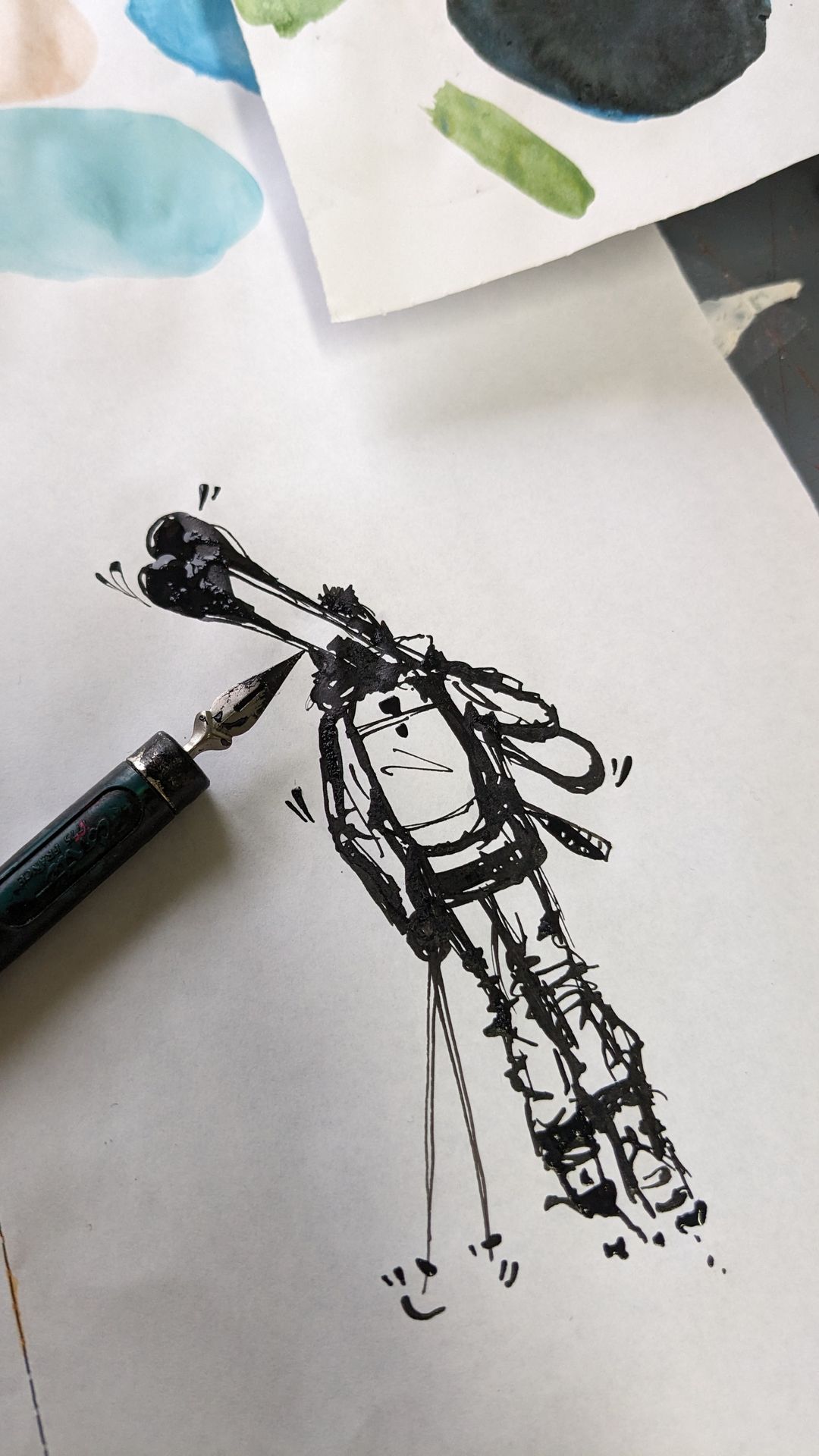 Pour mes illustrations, j'utilise une plume de calligraphie et de l'encre de chine, et j'aime ajouter des touches de couleur avec de l'aquarelle pour donner vie à mes dessins.